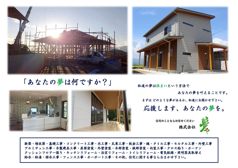 新築、増改築、リフォーム工事の事なら山梨県甲州市塩山の工務店「株式会社夢や」へ。デザイナーの住宅設計も承っております。